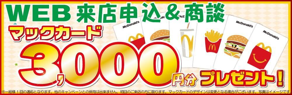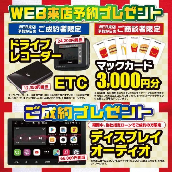 ※初回ご来店のお客様のみに適応※商談していただき、お見積りを提案させていただいた方に適応※Webからの来店予約のみ適応※車検・点検のご予約は除く、お車をご購入の来店予約のみ適応※他のクーポンとの併用不可